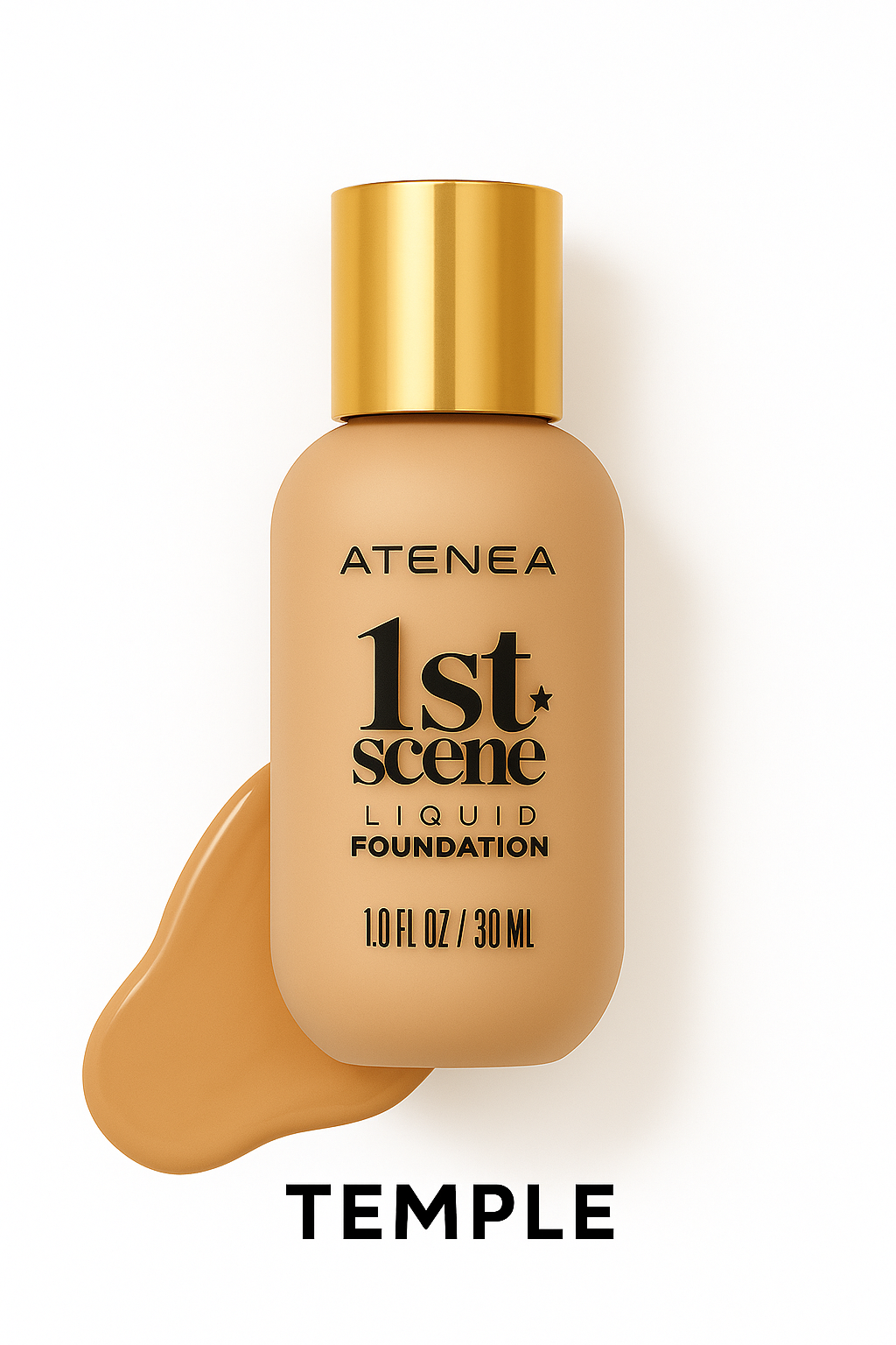 Base líquida 1ST. Scene de Atenea disponible en 9 tonos. Textura ligera y fluida, de acabado luminoso y cobertura modulable. Ideal para uso diario o eventos especiales.