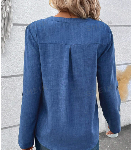 Color: Azul Estilo: Casual Tipo de Estampado: Liso Tipo: Top Escote: Escote V Longitud de la Manga: manga larga Detalles: Botón, Bolsillo, Botón delantero Tipos de Manga: Manga enrollada Longitud: Normal Tipo de ajuste: suelto Tejido: No-Elástico Material: Tela tricotada Composición: 100% Poliéster Instrucciones de Cuidado: lavadora o limpieza en seco profesional Transparente: No