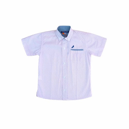 La camisa cuenta con un cuello clásico, manga corta y botones frontales que la hacen fácil de poner y quitar. El corte de la camisa es moderno y ajustado, lo que le da un aspecto elegante y juvenil.
