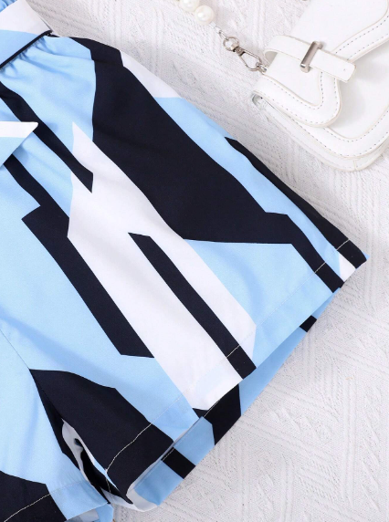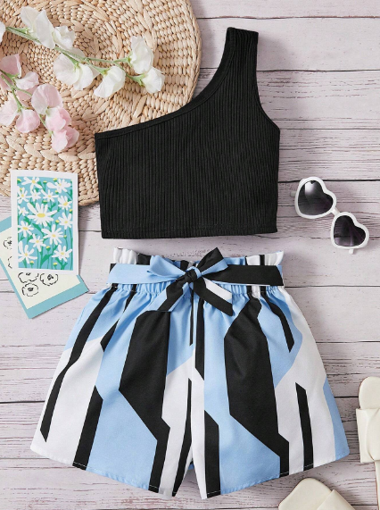 Conjunto de 2 piezas blusa de una hombro y short estampado para jovencitas