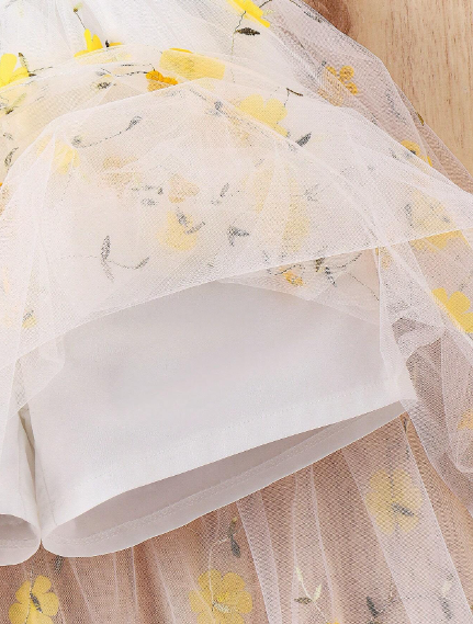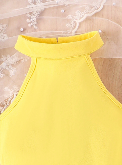 Conjunto de top halter y falda superpuesta de malla con bordado de flores para jovencitas