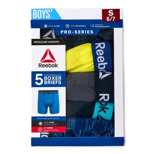 Los calzoncillos bóxer Reebok Pro-Series Performance para niño son una excelente opción para niños con un estilo de vida activo. El material de mezcla de poliéster proporciona un ajuste agradable y ceñido, evitando que se suban y resulten incómodos. El material de mezcla de poliéster suave es liviano y transpirable. Con un bolsillo contorneado, te mantendrán fresco y agradable durante todo el año. La cintura elástica no se dobla ni se enrolla y permanece en su lugar ofreciendo mayor comodidad con un diseño sin etiquetas. El paquete económico contiene 5 pares de calzoncillos bóxer de alto rendimiento por un precio bajo. Tendrás una semana completa de ropa interior sin gastar mucho dinero. Los calzoncillos bóxer de fácil cuidado están hechos de un material duradero de mezcla de poliéster y spandex. Los boxers se pueden lavar a máquina y sobrevivirán lavado tras lavado.