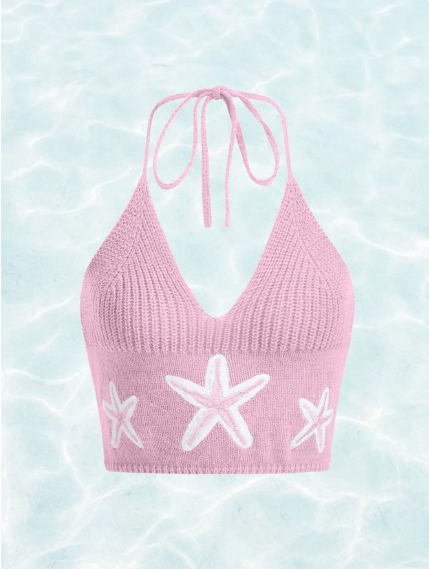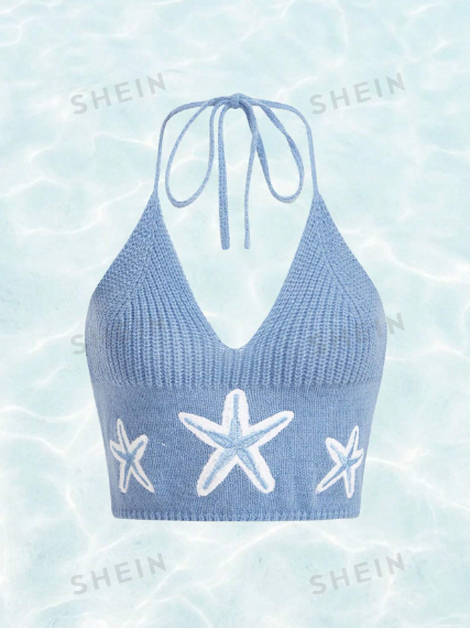 Top Juvenil De Tejido Halter Sin Espalda Con Adorno De Bordado Estrella De Mar