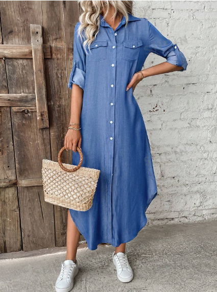 Este Vestido Camisero de Manga enrollada para mujer presenta un color Celeste y un estilo Informal. El sólido Tipo de Estampado se acentúa con un bolsillo delantero y un botón, mientras que el escote Cuello de Camisa añade un toque de formalidad. Las mangas manga larga se pueden remangar para una apariencia relajada, y la cintura Natural combina perfectamente con el Asimétrico y el Recto Corte del Bajo para un ajuste cómodo. Confeccionada con un tejido No-Stretch de 50% Poliéster y 50% Viscosa, esta camisa es duradera y elegante. Las instrucciones de cuidado incluyen lavado a máquina o limpieza en seco profesional y el material no es transparente.