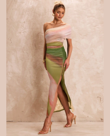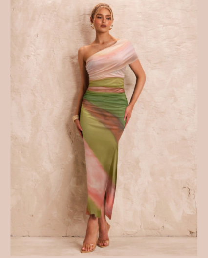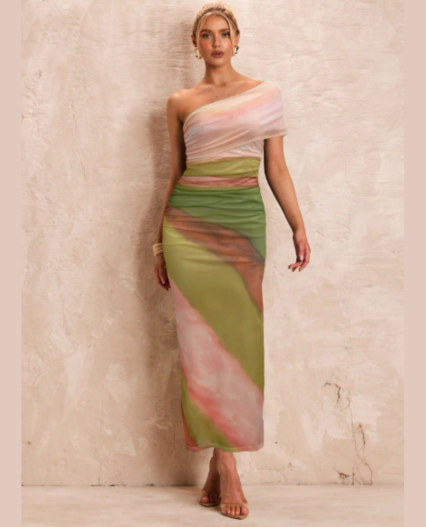 Deslumbra con este elegante vestido midi de un hombro, diseñado con un print artístico en tonos verdes y rosados que estiliza la silueta. Su tela ligera y de caída suave se adapta cómodamente al cuerpo, mientras que el corte asimétrico aporta un toque moderno y sofisticado. Ideal para eventos especiales, cenas o salidas nocturnas. Combínalo con tacones y accesorios dorados para un look impecable.