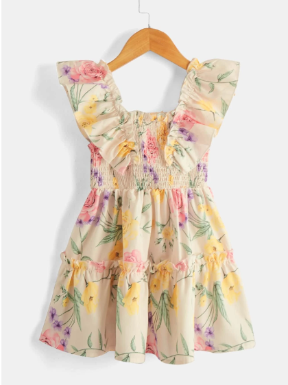 Vestido para niña diseño floral torso fruncido y detalles de volantes