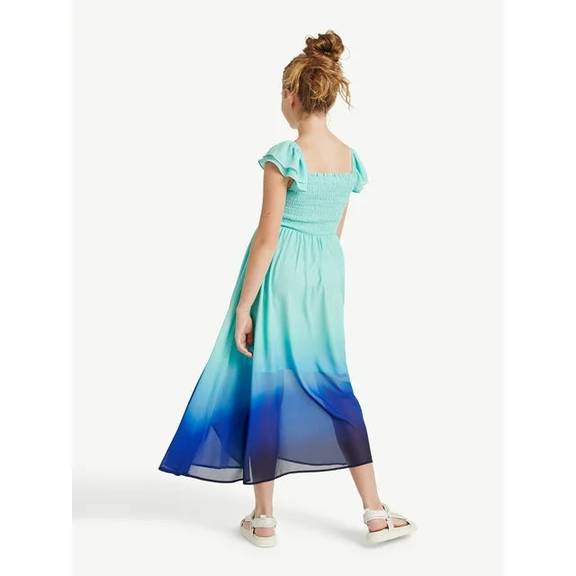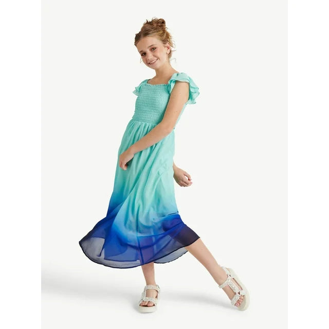 Deja que tu joven fashionista brille con este adorable vestido largo Justice Smocked. Diseñado pensando tanto en la moda como en la comodidad, este vestido es perfecto para las pequeñas princesas de tu vida. El corpiño fruncido no solo garantiza un ajuste ceñido y cómodo, sino que también añade un toque de estilo moderno al guardarropa de su niña. Las delicadas mangas onduladas aportan un aspecto divertido y encantador, haciendo que tu pequeño se sienta como una verdadera estrella de la moda. Ya sea una celebración de cumpleaños, una reunión familiar o simplemente un día de diversión, este vestido es la elección perfecta para crear momentos memorables y looks elegantes. Material: 100% poliéster Cuidado: Lavable a máquina País de origen: Importado Ajuste: Estándar Cierre: estilo sin cordones Bolsillos: Sin bolsillos Longitud: Longitud máxima Características: top fruncido, manga acampanada, ajuste y vuelo, efecto tinte degradado