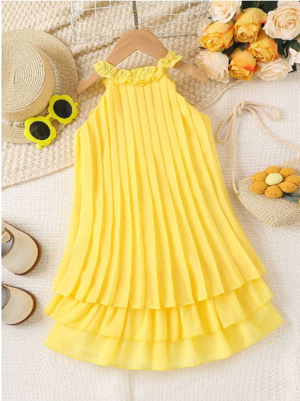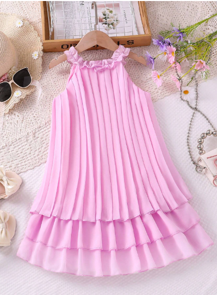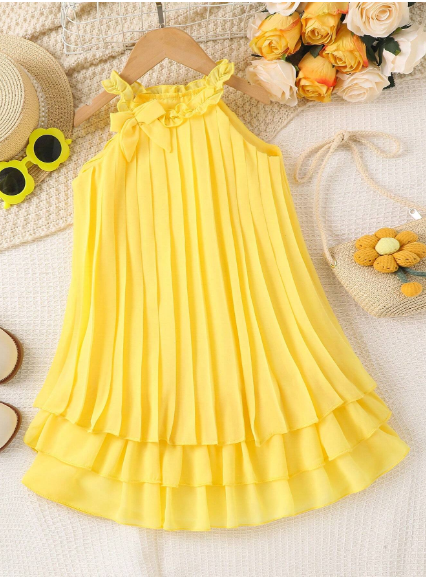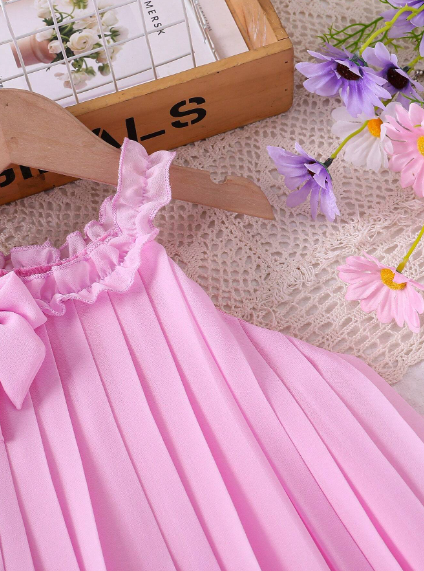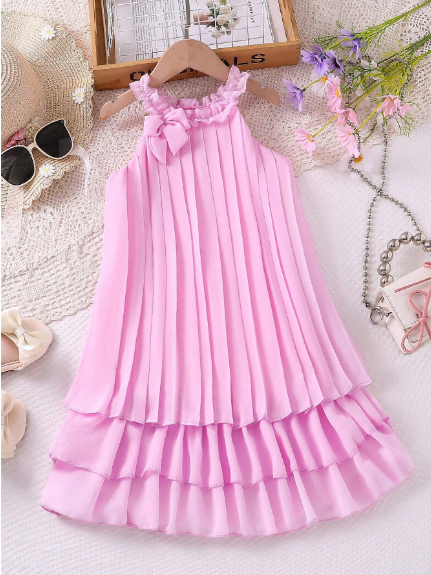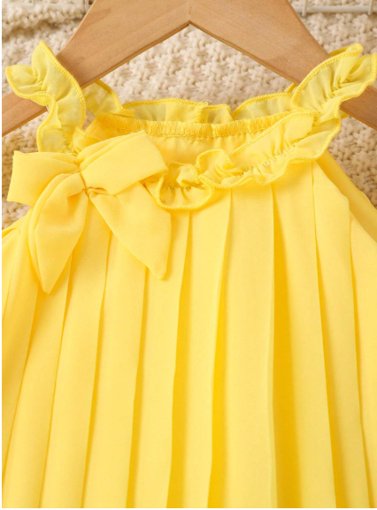 Vestido plizado color solido con decoración de lazo sin mangas para niña